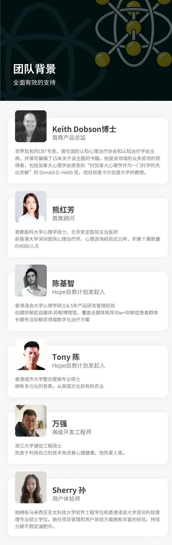 從團隊方面來看,Hope團隊,是國內(nèi)最早專注抑郁預(yù)防與復(fù)發(fā)的數(shù)字療法的研發(fā)團隊。其中不乏國內(nèi)外知名心理學(xué)教授、專家及學(xué)者。