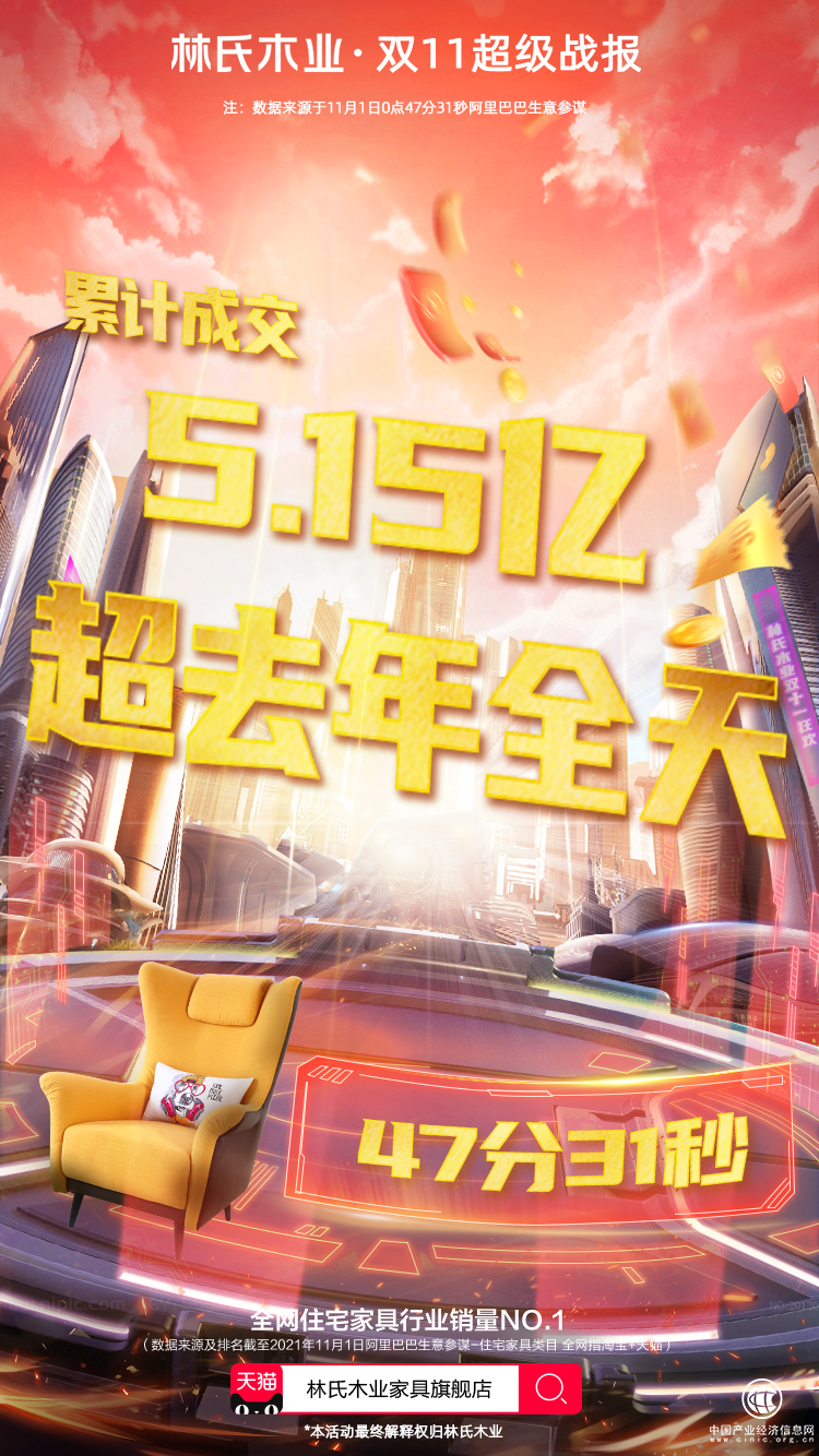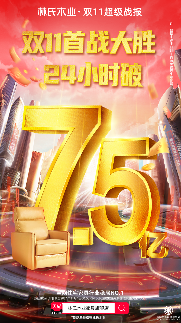 11月4日消息,據(jù)林氏木業(yè)官方數(shù)據(jù)顯示,在天貓雙11第一波售賣期中,林氏木業(yè)僅花47分鐘31秒便突破5.15億成交額,超去年全天;最終收獲單日破7.5億的戰(zhàn)績(jī),為雙11打響開門紅。(數(shù)據(jù)來源及排名截至2021年11月1日阿里巴巴生意參謀)