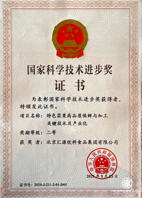 日前,2020年度國家科學技術獎勵大會在北京人民大會堂舉行。由匯源集團參與完成的“特色漿果高品質保鮮與加工關鍵技術及產(chǎn)業(yè)化”項目榮獲國家科學技術進步獎二等獎。這是匯源面對產(chǎn)業(yè)升級發(fā)展需求、以產(chǎn)學研合作突破核心技術的重要成果。