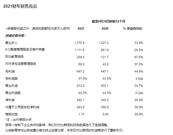 “2021財(cái)年是充滿挑戰(zhàn)的一年,復(fù)雜的經(jīng)營環(huán)境和新的法律政策給教育行業(yè)帶來了許多新變化。得益于我們始終堅(jiān)持的輕資產(chǎn)發(fā)展模式,2021財(cái)年我們將海亮教育的優(yōu)質(zhì)教育服務(wù)覆蓋到了更多的學(xué)生、家長以及運(yùn)營管理學(xué)校,取得了滿意的成績。我們2021財(cái)年的營業(yè)收入達(dá)到人民幣13.758億元(2.131億美元),較去年同期的人民幣10.274億元增長33.9%。毛利潤達(dá)到人民幣6.472億元(1.002億美元),同比增長44.8%。營業(yè)利潤達(dá)到人民幣6.128億元(9,491萬美元),同比增長34.7%。歸屬于公司股東的凈利潤為人民幣4.830億元(7,481萬美元),較去年同期的人民幣3.500億元增長38.0%?!焙A两逃聲?huì)主席兼首席執(zhí)行官陳軍偉博士評(píng)論道,“新的法律政策帶來了許多挑戰(zhàn),但也帶來了一系列新的機(jī)遇。著眼未來,民辦學(xué)校中能夠繼續(xù)不斷發(fā)展的一定是師資、教學(xué)、品牌、服務(wù)一流的學(xué)校。海亮教育立足“人皆有才,人人成才,讓每個(gè)生命出彩”的辦學(xué)理念,通過多樣化的模式致力于改善和提升海亮教育及運(yùn)營管理學(xué)校的教育服務(wù)和教學(xué)質(zhì)量。例如,提供豐富教學(xué)資源和教學(xué)工具的星課堂SaaS服務(wù)、助力教師掌握學(xué)生個(gè)性化學(xué)習(xí)情況的學(xué)情分析系統(tǒng)以及連接外出務(wù)工家長和留守兒童的Hai家校,都將有助于縣域地區(qū)教育公平的推進(jìn)、教學(xué)質(zhì)量的提升以及家庭教育負(fù)擔(dān)的降低。結(jié)合海亮教育26年辦學(xué)經(jīng)驗(yàn)和成果,我們將圍繞學(xué)校、教師、學(xué)生及家長等不同需求主體,加深與各領(lǐng)域頭部公司的合作,輸出教育管理咨詢、后勤及供應(yīng)鏈管理、教育科技及信息化建設(shè)、師資培訓(xùn)、課后素質(zhì)教育、研留學(xué)等學(xué)校服務(wù),構(gòu)建一個(gè)K12教育服務(wù)全產(chǎn)業(yè)生態(tài)圈,為社會(huì)帶來更加長遠(yuǎn)、廣泛的效益?!?/p>