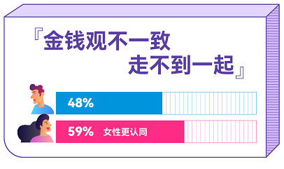 在親密關(guān)系中關(guān)于“金錢矛盾”的起因有很多種,其中很大部分是因?yàn)榻疱X觀的不同——對于金錢觀,每個人都有不同想法與態(tài)度。調(diào)查結(jié)果顯示:在“金錢觀差異大的人很難走到一起”這一選項(xiàng)中,男性認(rèn)同比例達(dá)到48%,而女性認(rèn)同占比高達(dá)59%;在“男性理應(yīng)在戀愛中承擔(dān)更多經(jīng)濟(jì)責(zé)任”這一選項(xiàng),也是單身群體認(rèn)同度比較高的選項(xiàng),男性認(rèn)同占比42%,女性認(rèn)同占比也達(dá)到了34%。