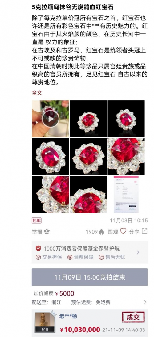 2021年微拍堂“11.9微拍盛典”圓滿結(jié)束,當(dāng)天曉文拍賣「5克拉緬甸抹谷無燒鴿血紅寶石」以10,030,000元的成拍冠絕平臺(tái)。