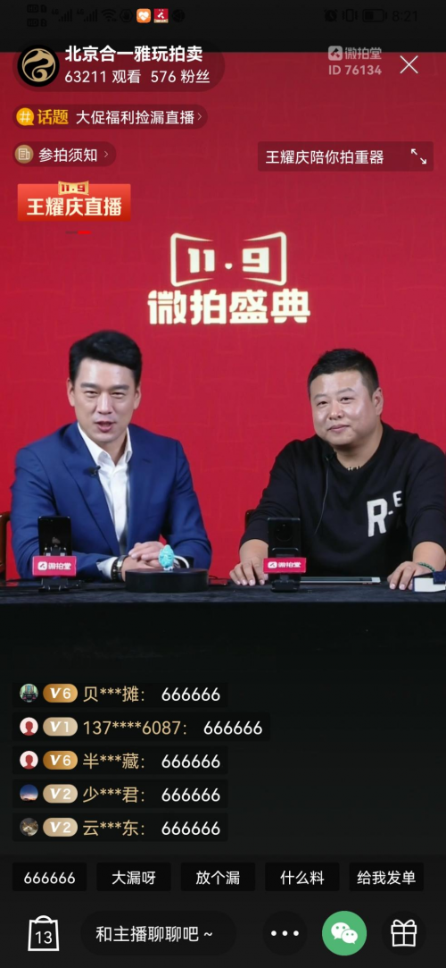 2021“11.9微拍盛典”打破以往單純平臺(tái)促銷的活動(dòng)模式,在進(jìn)一步加大優(yōu)惠、福利的基礎(chǔ)之上,與北京合一雅玩拍賣、曉文拍賣、逸成拍賣等傳統(tǒng)競(jìng)拍機(jī)構(gòu)聯(lián)袂推出高端藝術(shù)收藏品競(jìng)拍,讓大眾玩家一睹重器風(fēng)采、滿足資深玩家收藏需求,并跨界聯(lián)合明星王耀慶助陣。