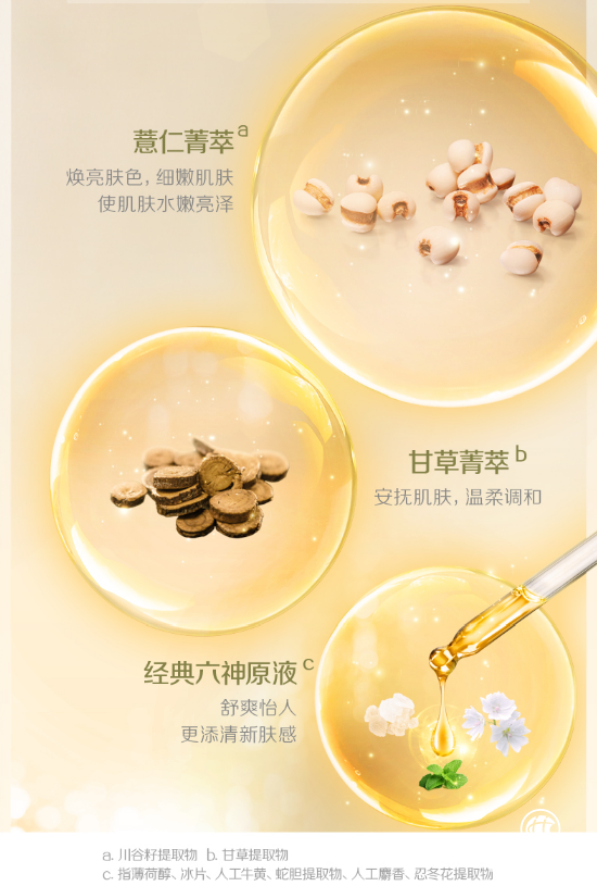 六神瀅亮菁萃沐浴露還特別加入了甘草植萃精華和“六神原液”,補(bǔ)充肌膚養(yǎng)分的同時(shí),令肌膚凈潤(rùn)瀅亮。