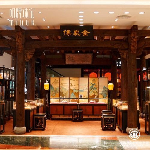 在傳承中華傳統(tǒng)文化,展現(xiàn)中國傳統(tǒng)工藝之美方面,“傳家金”一直都在致力于探索東方的審美意趣。不僅僅是金飾,就連巡展的門店布置都是選用有著東方特色的古建筑。截至目前,明牌珠寶“傳家金”線下店鋪遍布北京、武漢、南京、杭州、西安、沈陽等城市的核心商業(yè)中心,已經(jīng)基本形成在中國一線城市商業(yè)中心完整的線下銷售網(wǎng)絡(luò)。當你走進“傳家金”門店時,首先吸引你的必定是那精致的木雕工藝。“傳家金·天官賜?!辈捎昧嗣髑鍟r期民間木雕中常見的吉祥題材,用生動的福壽神祇形象,表達降福于民的希冀;“傳家金·獅事如意”以古木為底,在牛腿處雕刻一對祥瑞之獅,“獅”諧音“事”,寓意事事如意;“傳家金·花開富貴”以傳奇的鏤雕典范著稱,采用中國傳統(tǒng)繪畫中的鳥瞰式透視為構(gòu)圖特點,在梁托、斗拱、雀替、牛腿處精雕細琢,寓意對美滿幸福、富麗繁華生活的向往;“傳家金·攜子上朝”取自唐朝開國大將郭子儀帶子上朝的歷史典故,寓意“大富貴亦壽考”。