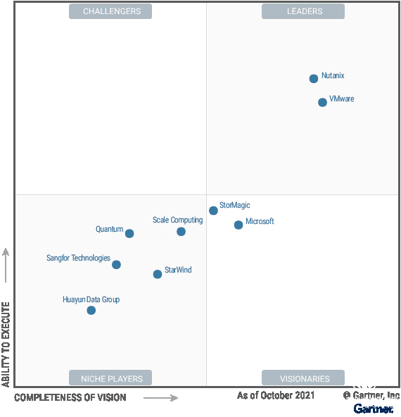 近日,國(guó)際權(quán)威分析機(jī)構(gòu)Gartner發(fā)布了2021年全球超融合基礎(chǔ)設(shè)施軟件魔力象限(Magic Quadrant for Hyperconverged Infrastructure Software),全球共9家超融合廠商入選,華云數(shù)據(jù)和深信服作為中國(guó)廠商代表,已連續(xù)三年進(jìn)入Gartner超融合魔力象限。