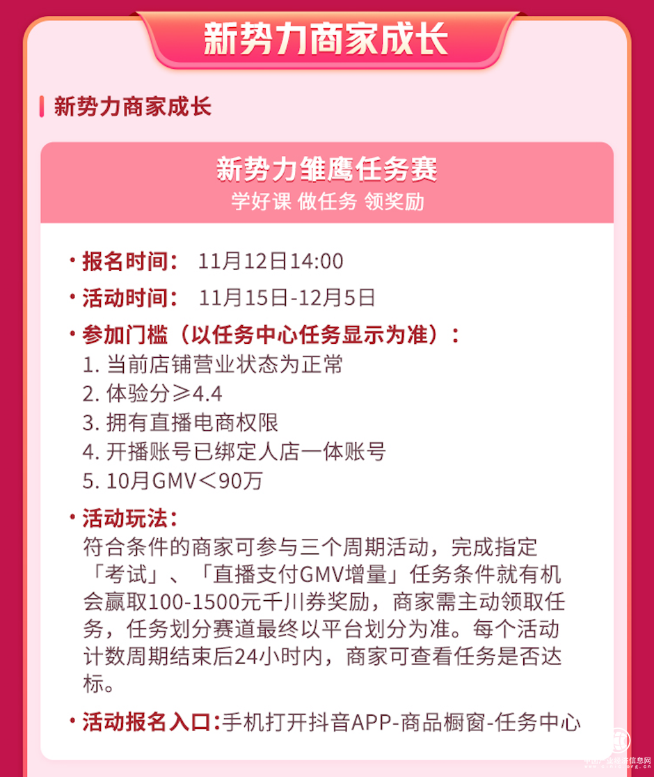 為了更好地幫助新勢(shì)力商家深刻理解興趣電商、掌握抖音電商玩法、收獲更大成長。近期,抖音電商正式推出了「新勢(shì)力雛鷹學(xué)習(xí)任務(wù)賽」 。該任務(wù)賽面向平臺(tái)符合參賽要求的中小商家展開,為商家提供課程培訓(xùn)、考試任務(wù)及豐厚獎(jiǎng)勵(lì),助力新勢(shì)力商家快速實(shí)現(xiàn)經(jīng)營破局。