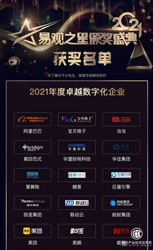 10月28日晚,“數(shù)字之光”2021易觀之星頒獎盛典圓滿落下帷幕。頒獎典禮上各式獎項集中綻放,100家企業(yè)、品牌經(jīng)過激烈的競爭和角逐,脫穎而出,評選出“2021年度卓越數(shù)字化企業(yè)”、“2021年度卓越數(shù)字應用”、“2021年度新銳數(shù)字應用” “2021年度用戶推薦數(shù)字應用”四大榮譽稱號。其中當當網(wǎng)、阿里巴巴、美團等互聯(lián)網(wǎng)大廠紛紛上榜年度卓越數(shù)字化企業(yè)。