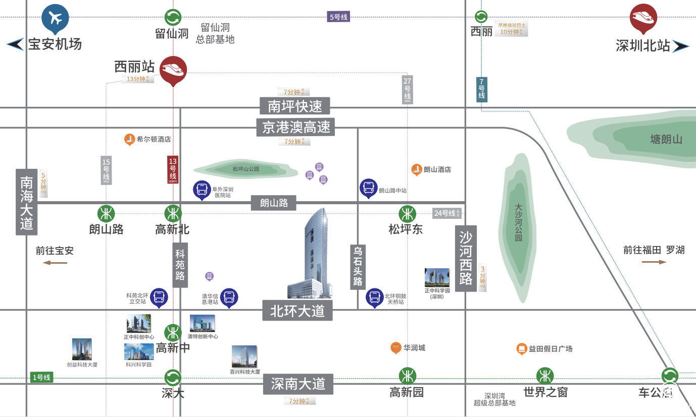 同方信息港緊鄰北環(huán)大道,7分鐘可達南坪快速、京港澳高速等城市動脈級公路,坐享四線地鐵、八大公交站點,通達各區(qū)腹地。為進一步減少企業(yè)客戶通勤時間,園區(qū)配置接駁巴士,早晚多班次10分鐘直達西麗地鐵站。此外,項目直連“13臺25線”超大規(guī)模西麗高鐵站,以多維交通出行,締造1小時灣區(qū)城際商務(wù)圈。