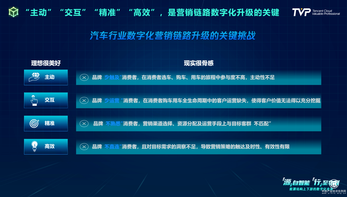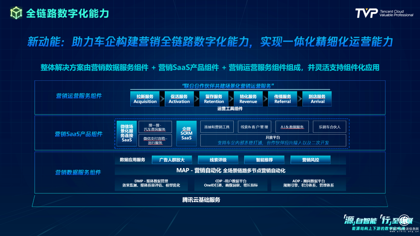 當前,汽車行業(yè)的營銷鏈路正面臨全面升級,更主動、交互的溝通模式,和更精準、高效的信息傳遞和服務將成為未來汽車營銷的新常態(tài)。騰訊智慧出行提出了一套全鏈路數(shù)字化能力的解決方案,助力車企實現(xiàn)一體化、精細化運營能力。