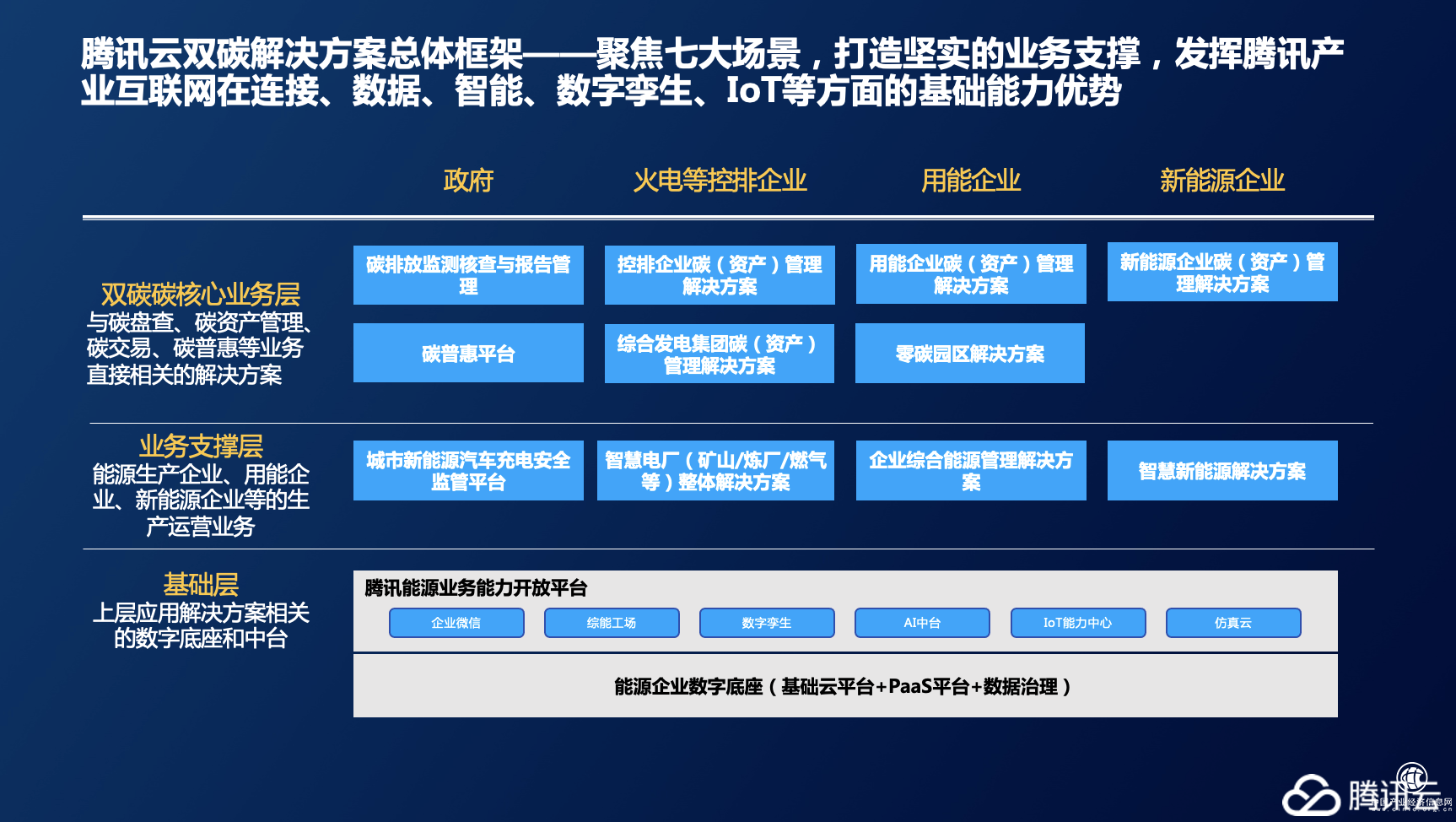 騰訊云雙碳解決方案總體框架——聚焦七大場(chǎng)景,打造堅(jiān)實(shí)的業(yè)務(wù)支撐,發(fā)揮騰訊產(chǎn)業(yè)互聯(lián)網(wǎng)在連接、數(shù)據(jù)、智能、數(shù)字孿生、IoT等方面的基礎(chǔ)能力優(yōu)勢(shì)。
