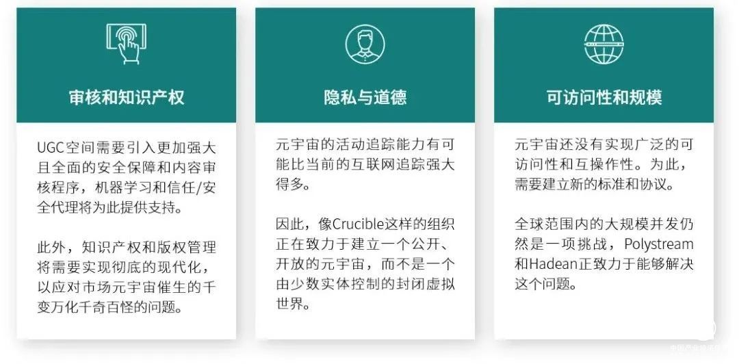 報告指出,元宇宙將會成為游戲的下一個階段,會將如虛擬音樂會、虛擬時裝秀、IP聯(lián)動,以及產(chǎn)品聯(lián)名等非游戲體驗也整合其中,由技術(shù)、消費者與游戲的互動方式來共同驅(qū)動。但除了技術(shù)層面反復(fù)提及的算力和硬件問題外,報告羅列了若干阻礙實現(xiàn)元宇宙這個虛擬烏托邦的現(xiàn)實因素。包括大量UGC內(nèi)容需要更加強大且全面的安全保障和審核程序,知識產(chǎn)權(quán)和版權(quán)管理的現(xiàn)代化,在元宇宙中如何更好保護個人隱私以及新的標(biāo)準(zhǔn)協(xié)議的缺失,都是人們構(gòu)建元宇宙的攔路虎。