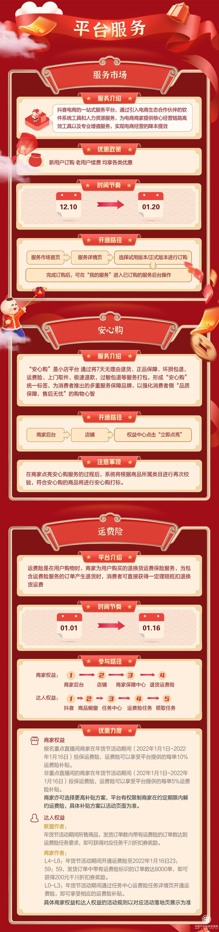 抖音好物年貨節(jié)將于2022年1月1日正式開始,并于1月16日結(jié)束。活動(dòng)期間,抖音好物年貨節(jié)還將推出好物直播間、家鄉(xiāng)年貨短視頻爭(zhēng)霸賽、全民任務(wù)賽、巔峰任務(wù)賽等多種玩法及平臺(tái)技術(shù)服務(wù)費(fèi)限時(shí)返還、百億補(bǔ)貼等多重運(yùn)營(yíng)支持政策,幫助合作伙伴快速達(dá)成銷售目標(biāo)。