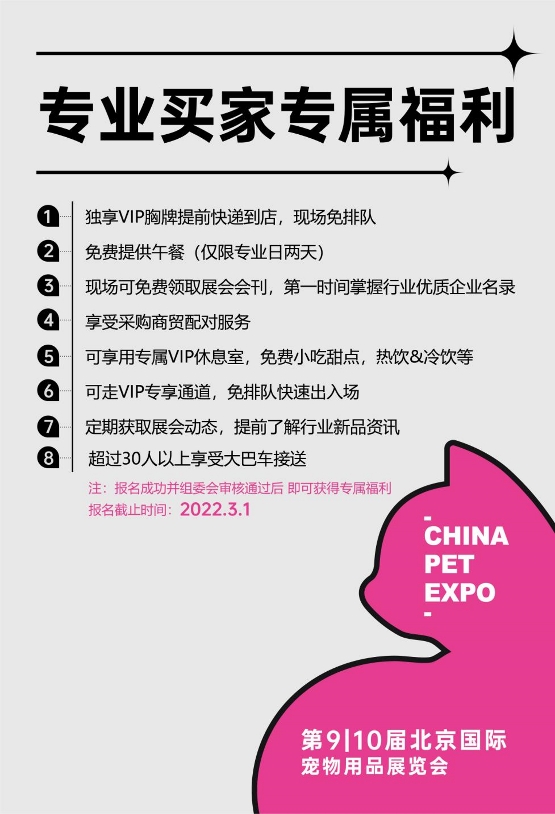 2022年雄鷹京寵展將于4月1-4日在中國(guó)國(guó)際展覽中心(順義新館)盛大召開!明年將有1200+優(yōu)質(zhì)企業(yè)參展、8000+優(yōu)質(zhì)品牌、120000+展出面積,預(yù)登記全面開啟~ 快來(lái)報(bào)名吧!