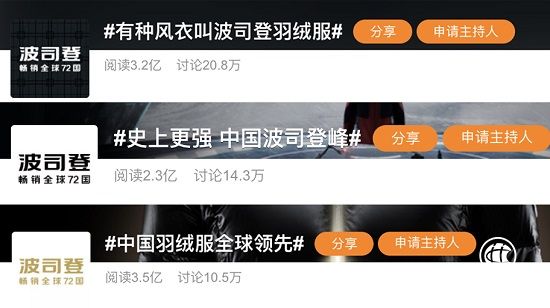 作為備受關(guān)注的“國民羽絨服”品牌,波司登首先以品質(zhì)打下堅(jiān)實(shí)消費(fèi)者基礎(chǔ),今年在羽絨服領(lǐng)域的創(chuàng)新有目共睹,成為活躍在熱銷熱議榜的“常青樹”。2021年以來,波司登屢次登上熱銷話題榜,#有種風(fēng)衣叫波司登羽絨服#話題閱讀量達(dá)3.2億,討論量達(dá)20.8萬條;#史上最強(qiáng) 中國波司登峰#話題閱讀量達(dá)2.3億、#中國羽絨服全球領(lǐng)先#話題閱讀量達(dá)3.5億,品牌在主流消費(fèi)群體中的熱度不減。