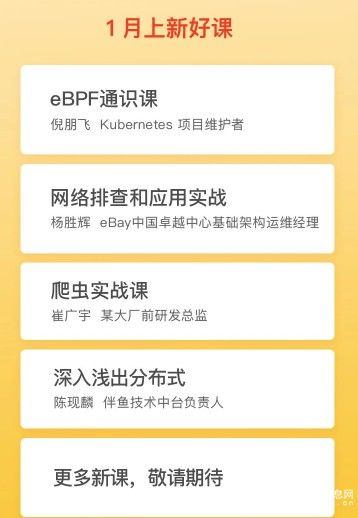 從極客時(shí)間官方發(fā)布的信息來看,一月份的新課程分別針對(duì)不同的領(lǐng)域,涉及了編程、網(wǎng)絡(luò)以及技術(shù)中臺(tái)等一系列內(nèi)容,此舉旨在滿足不同人士的學(xué)習(xí)需要。以《eBPF通識(shí)課》為例,該課程將帶領(lǐng)學(xué)員們了解eBPF相關(guān)知識(shí),為大家的后續(xù)深入學(xué)習(xí)和應(yīng)用打好基礎(chǔ)。eBPF作為L(zhǎng)inux中用處最大的技術(shù)已經(jīng)成為了頂級(jí)子模塊,學(xué)習(xí)eBPF的人群越來越多,極客時(shí)間推出的該課程無疑給大家提供了很好的機(jī)會(huì)。
