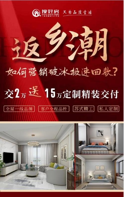 現(xiàn)如今,房企想要踏實(shí)經(jīng)營必須直面客戶需求,回歸產(chǎn)品與服務(wù)。真營銷不是堆砌華麗的套路,而是想百姓之所想?;剜l(xiāng)購房的打工者追求性價比,希望把辛苦賺來的血汗錢花在刀刃上。由于在老家時間精力有限,更想不用多為后續(xù)裝修操心。搜好房C2F平臺真切感受到房企面臨的壓力和打工者購房的不易,真心實(shí)意為項(xiàng)目排憂解難,為客戶讓利,因此在返鄉(xiāng)潮來臨之際首倡“購房+2萬,送15萬定制精裝交付”的變革營銷新模式。