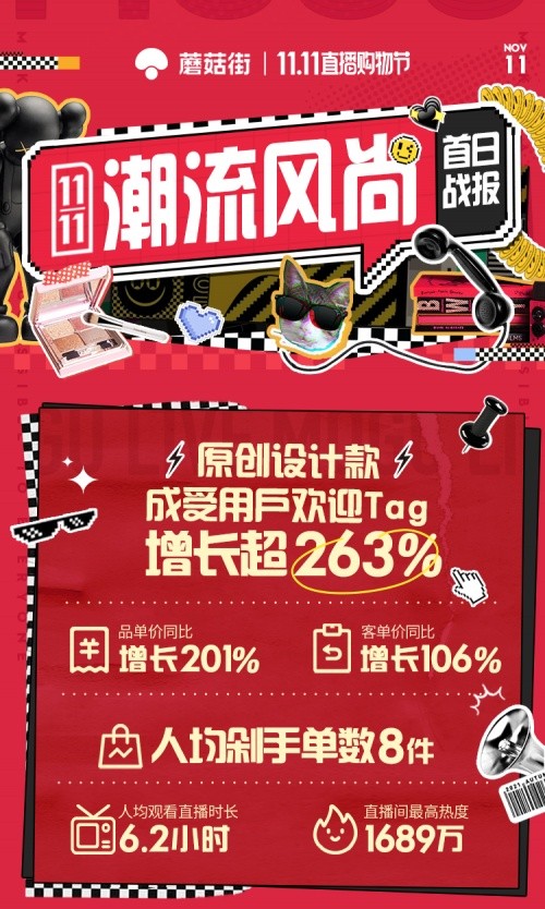 戰(zhàn)報顯示:今年的雙11蘑菇街用戶人均消費(fèi)額(客單價)同比去年增長106%,商品單價同比增長201%。雙11期間,蘑菇街用戶人均觀看直播時長達(dá)6.2小時。蘑菇街客單價、品單價、客件數(shù)均取得明顯增長,且原創(chuàng)設(shè)計女裝領(lǐng)域取得重大突破。