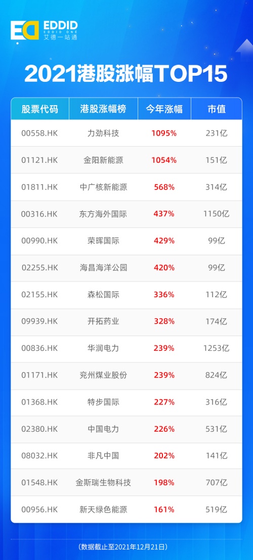剔除市值百億以下的股票,結合板塊熱度,本文整理出2021年港股漲幅Top 15排行榜。