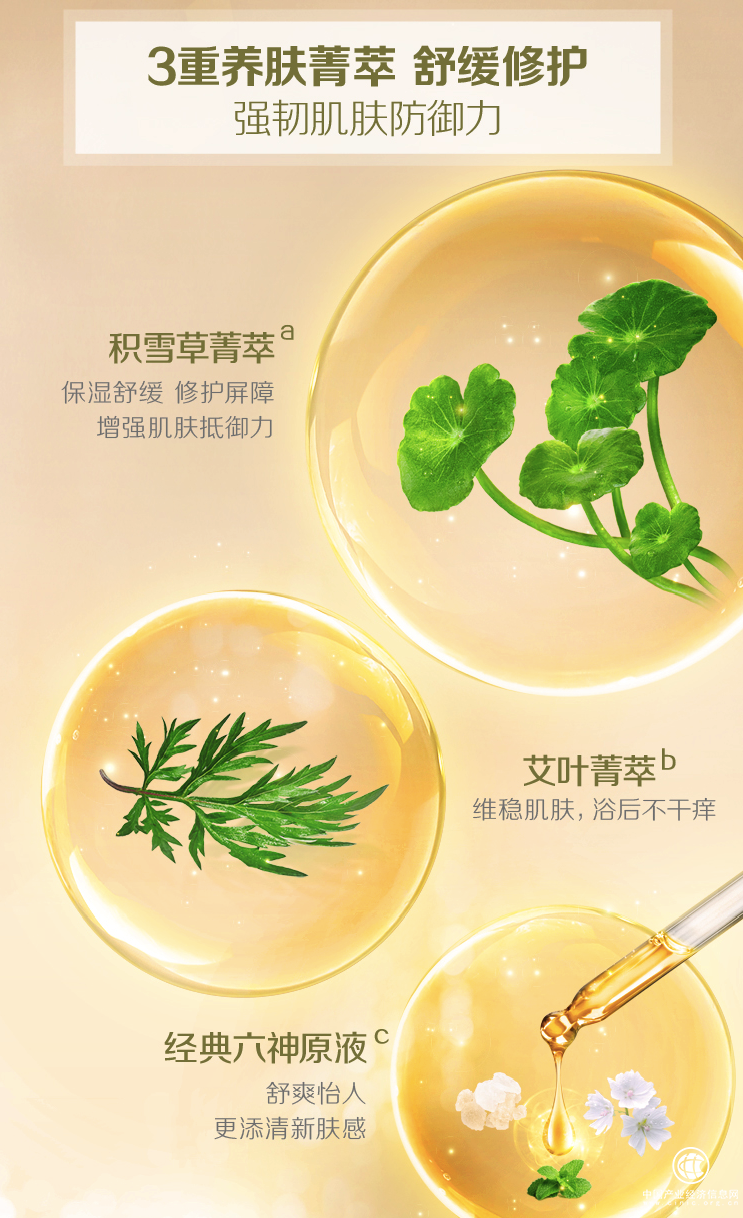 在積雪草發(fā)揮建立肌膚屏障功效時(shí),艾葉菁萃能夠幫助維穩(wěn)肌膚,抗炎抗敏,幫助緩解脆弱肌膚沐浴后發(fā)癢的狀況。而六神菁萃沐浴露系列中的經(jīng)典成分六神原液,則是起到一個(gè)凈煥肌理,平衡肌膚環(huán)境的作用。三種成分就如“鐵三角”般,缺一不可。