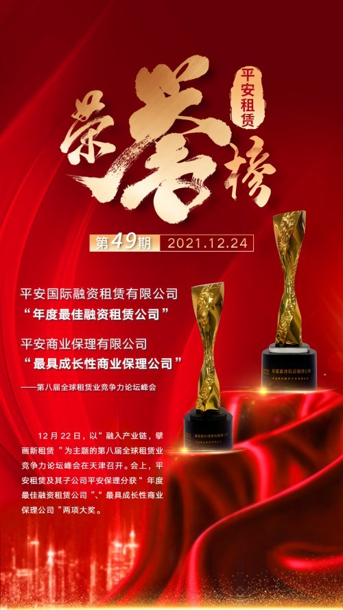 近日,第八屆全球租賃業(yè)競爭力論壇峰會在天津召開。本次峰會以“融入產(chǎn)業(yè)鏈,擘畫新租賃”為主題,探索租賃業(yè)可持續(xù)發(fā)展道路,以理性、建設(shè)性態(tài)度促進(jìn)融資租賃業(yè)健康發(fā)展。平安國際融資租賃有限公司(下稱“平安租賃”)受邀參會,并獲得“年度最佳融資租賃公司”榮譽(yù)。同時(shí),平安租賃子公司平安商業(yè)保理有限公司(下稱“平安保理”)獲得“最具成長性商業(yè)保理公司”獎項(xiàng)。