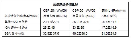 ?為了支持與中國監(jiān)管機構(gòu)的溝通,本研究預(yù)先計劃了對中國亞組人群數(shù)據(jù)進行分析。相對于整體研究人群,中國亞組人群(n=32)在基線時EASI 評分的中位數(shù)更高、IGA 評分= 4 的比例更高、BSA皮膚受累面積更大。如下表所示,中國亞組人群中入組的患者,顯示出CBP-201有更大的治療獲益。