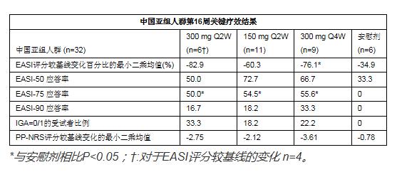 ?本研究中,患者基線時的EASI評分中位數(shù)較低且呈非正態(tài)分布,為了降低這些偏倚產(chǎn)生的影響,分析了EASI評分較基線下降百分比的中位數(shù):300 mg Q2W, 150 mg Q2W, 300 mg Q4W組分別下降79.3%, 64.7%, 72.4%,安慰劑組下降41.0%;顯示出比EASI評分較基線變化百分比的最小二乘均值有更大的降低。
