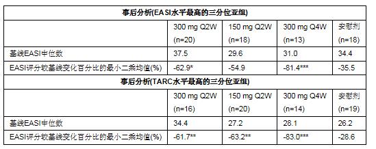 ?根據(jù)EASI評分高低,對基線時疾病嚴重程度較整體研究人群高的亞組患者(n=69)進行了探索性的事后分析,結(jié)果顯示出該組人群的EASI評分較基線下降更多且安慰劑效應(yīng)更低。類似地,對本研究中相較于整體人群具有更高的基線胸腺和活化調(diào)節(jié)趨化因子(TARC或者CCL17,一種與AD患者疾病活動度相關(guān)的生物標志物)水平的患者(n=69)也進行了事后分析,顯示出他們也較研究整體人群獲得了更多的EASI評分下降及更低的安慰劑效應(yīng)。