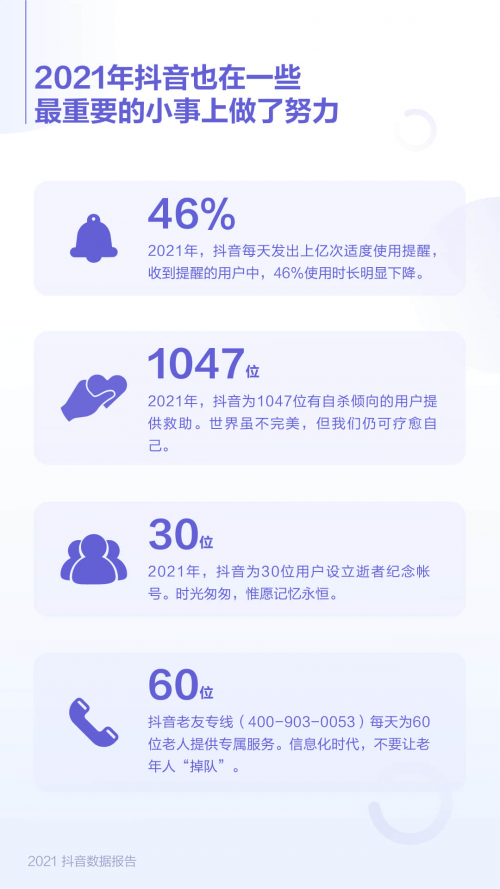 此外,在報告中,抖音還公布了其2021年在產(chǎn)品人文關(guān)懷方面做出的更多嘗試。報告顯示,過去一年,抖音為1047位有自殺傾向的用戶提供救助,也為30位用戶設(shè)立逝者紀(jì)念帳號。而針對老年人如何良好擁抱數(shù)字生活的問題,抖音推出了多項適老化舉措。其中,抖音推出的“老友專線”,每天為60位老人提供專屬服務(wù)。