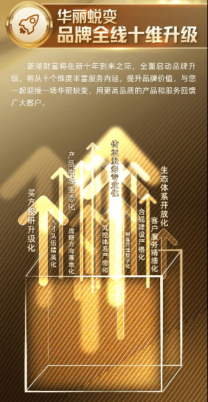 在新十年發(fā)展目標(biāo)指引下,新湖財富全線十維進(jìn)階,品牌將從買方投研升級化、產(chǎn)品構(gòu)成生態(tài)化、傳承服務(wù)專業(yè)化、生態(tài)體系開放化、客戶服務(wù)精細(xì)化、合規(guī)建設(shè)嚴(yán)格化、風(fēng)控體系嚴(yán)密化、戰(zhàn)略方向落地化、財富管理數(shù)字化、人才隊伍精英化這十個維度全面升級。品牌升級后的新湖財富,未來將持續(xù)不斷積累智慧,持續(xù)賦能,立足更高遠(yuǎn)的戰(zhàn)略、更深入的思考,成就財富管理服務(wù)的中國模式。