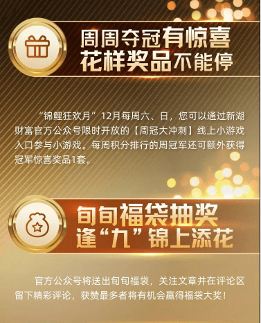 此外,為配合品牌升級活動,新湖財富還推出了驚喜福利,參與新湖財富官方公眾號限時開放的線上小游戲,花樣獎品贏不停,周周有好禮,旬旬發(fā)福袋,持續(xù)關(guān)注,積極互動,還有機(jī)會贏得讓人驚艷不已的“超級錦鯉”重磅福袋。