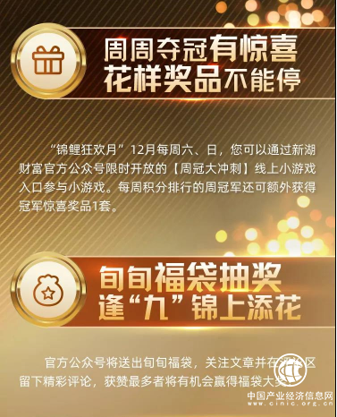 在12月“品牌升級錦鯉狂歡月”,新湖財(cái)富推出驚喜福利,參與新湖財(cái)富官方公眾號限時(shí)開放的線上小游戲,花樣獎品贏不停,周周有好禮,旬旬發(fā)福袋,持續(xù)關(guān)注,積極互動,還有機(jī)會贏得讓人驚艷不已的“超級錦鯉”重磅福袋。