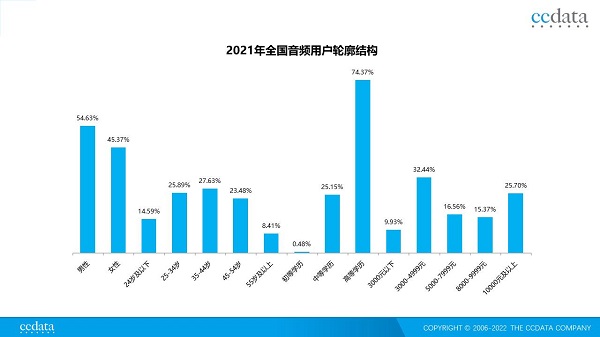 音頻用戶結(jié)構(gòu)品質(zhì)較高,含金量突出,在高端用戶中影響力與滲透力較強(qiáng)。25-54歲中青年用戶占比達(dá)到77.0%,高學(xué)歷用戶占比達(dá)到74.4%,月收入8000元及以上中高收入用戶占比達(dá)到41.1%,具有明顯的年輕化、高學(xué)歷、高收入特點(diǎn)。龐大的用戶規(guī)模與高品質(zhì)的用戶結(jié)構(gòu),將進(jìn)一步促進(jìn)音頻生態(tài)與產(chǎn)業(yè)的持續(xù)高速發(fā)展。