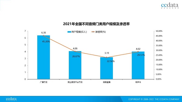 中科網(wǎng)聯(lián)數(shù)據(jù)顯示,2021年上半年,全國音頻用戶規(guī)模達(dá)到7.31億,滲透率達(dá)到51.8%。其中,廣播節(jié)目用戶規(guī)模達(dá)到6.38億,在主要音頻門類中位居榜首。在國家推進(jìn)媒體深度融合,做強(qiáng)新型主流媒體的要求下,全國廣播媒體進(jìn)行轉(zhuǎn)型升級,構(gòu)建音頻生態(tài),通過融合傳播提升媒體影響力與競爭力。