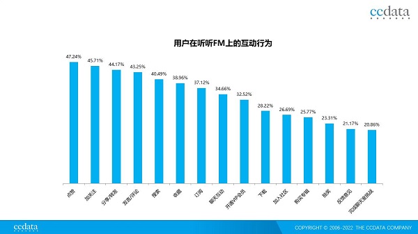廣播的優(yōu)勢在陪伴,主持人的強(qiáng)項(xiàng)在互動(dòng),聽聽FM建設(shè)以“音頻互動(dòng)”為主要特征的權(quán)威專業(yè)音頻平臺,強(qiáng)化互動(dòng)聊天室、聽聽號、聽聽電臺等互動(dòng)內(nèi)容供給,極大地激發(fā)了用戶的互動(dòng)熱情與活躍性。數(shù)據(jù)顯示,用戶在聽聽FM上互動(dòng)行為豐富且多元,點(diǎn)贊、加關(guān)注、分享/轉(zhuǎn)發(fā)、發(fā)言/評論、搜索、收藏、訂閱、聊天互動(dòng)、開通VIP會員等行為反映出用戶對聽聽FM的深度參與和高度忠誠,為聽聽FM進(jìn)一步的拉新促活與內(nèi)容優(yōu)化奠定了堅(jiān)實(shí)的基礎(chǔ)。