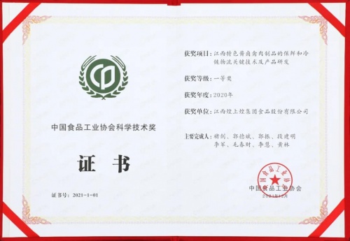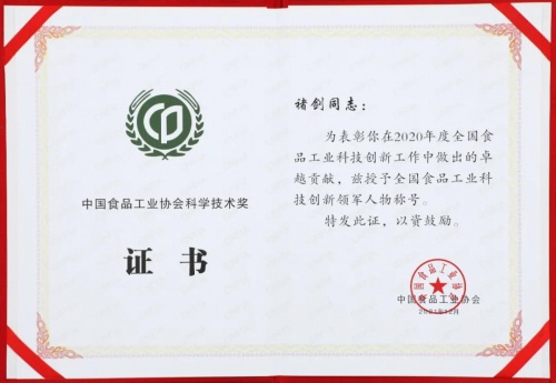 12月17-18日,以“科技·洞見未來”為主題的2021中國食品工業(yè)科技進(jìn)步大會在鄭州召開,會上頒發(fā)了“中國食品工業(yè)協(xié)會科學(xué)技術(shù)獎”?;蜕匣统袚?dān)的科研項目“江西特色醬鹵禽肉制品的保鮮和冷鏈物流關(guān)鍵技術(shù)及其產(chǎn)品研發(fā)”獲得了中國食品工業(yè)協(xié)會科學(xué)技術(shù)獎一等獎,煌上煌股份公司副董事長褚劍被授予“全國食品工業(yè)科技創(chuàng)新領(lǐng)軍人物”榮譽(yù)稱號。該獎項是煌上煌獲得2018-2019年度中國食品工業(yè)協(xié)會科學(xué)技術(shù)特等獎后,2020年度再次獲批,體現(xiàn)了煌上煌技術(shù)創(chuàng)新的持續(xù)性。
