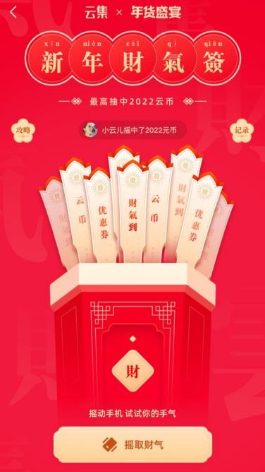 從1月10日起,云集APP將推出全場滿減券、下單發(fā)福袋、百萬紅包雨等優(yōu)惠活動。為增加與消費者的互動玩法,云集還推出新年財氣簽活動,用戶搖一搖就能抽到大額券、云幣等,最高可獲得2022云幣紅包。