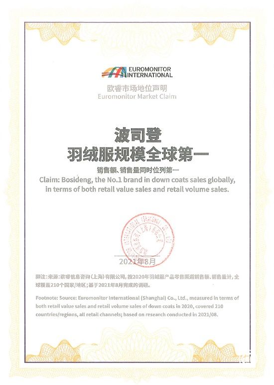 多年良好的經(jīng)營(yíng)成果讓波司登享譽(yù)國(guó)際,中國(guó)品牌在國(guó)際上的影響力顯著提升。2021年4月,國(guó)際五大品牌價(jià)值評(píng)估權(quán)威機(jī)構(gòu)之一Brand Finance,公布了每年一度的《全球最具價(jià)值服飾品牌排行榜50強(qiáng)》。榜單顯示,中國(guó)品牌波司登赫然在列,且以銷(xiāo)售增速第三(39%)的成績(jī)?nèi)脒x。2021年8月,世界權(quán)威調(diào)研機(jī)構(gòu)歐睿國(guó)際發(fā)布全球羽絨服調(diào)研報(bào)告,結(jié)果顯示:波司登羽絨服規(guī)模全球第一,銷(xiāo)售額、銷(xiāo)售量同時(shí)位列第一。
