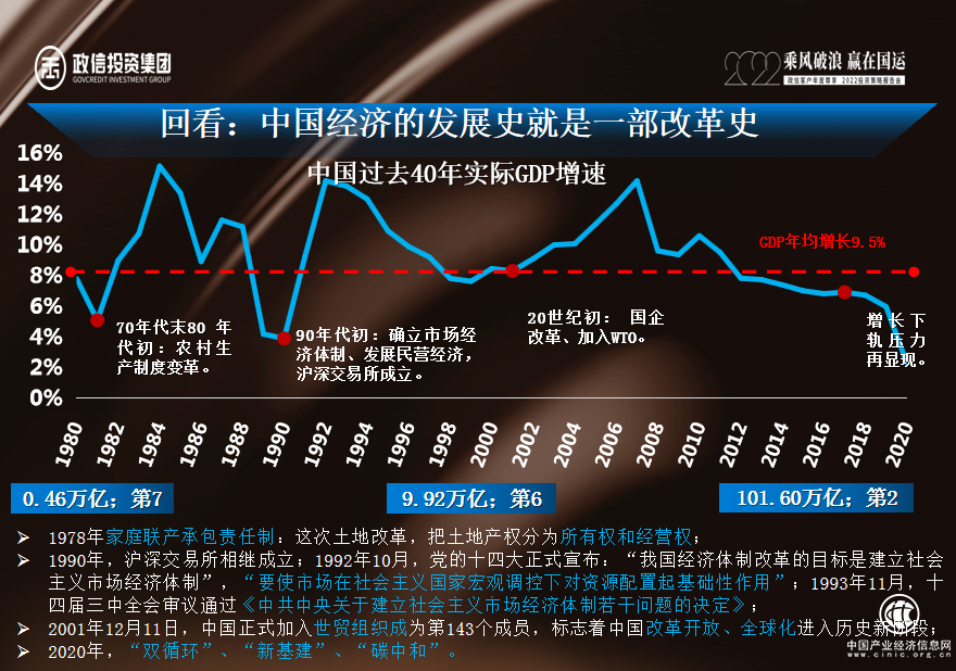 張奧平從改革開放40多年來的經(jīng)濟發(fā)展歷程分析,他通過數(shù)據(jù)顯示,每次中國經(jīng)濟從高速到低速的過程都伴隨著一次大的體制改革,而且以十年為一個周期。1980年開始全國范圍推行的家庭承包聯(lián)產(chǎn)責(zé)任制解放了生產(chǎn)力,我國的經(jīng)濟增速從4%-5%的水平一下子提高到15%,之后逐漸下滑到8%,而在1990年代初期,隨著改革的深入,我國確認了社會主義市場經(jīng)濟體制,再一次釋放了市場活動,資本市場的力量被點燃,又給經(jīng)濟帶來了長達幾年的10%以上的增速;而到了2000年,經(jīng)歷十幾年的入關(guān)談判,中國在2001年正式加入世界貿(mào)易組織(WTO),外貿(mào)的紅利得到極大釋放,中國成為世界工廠,中國的完整工業(yè)鏈體系也得到了完善和加強。
