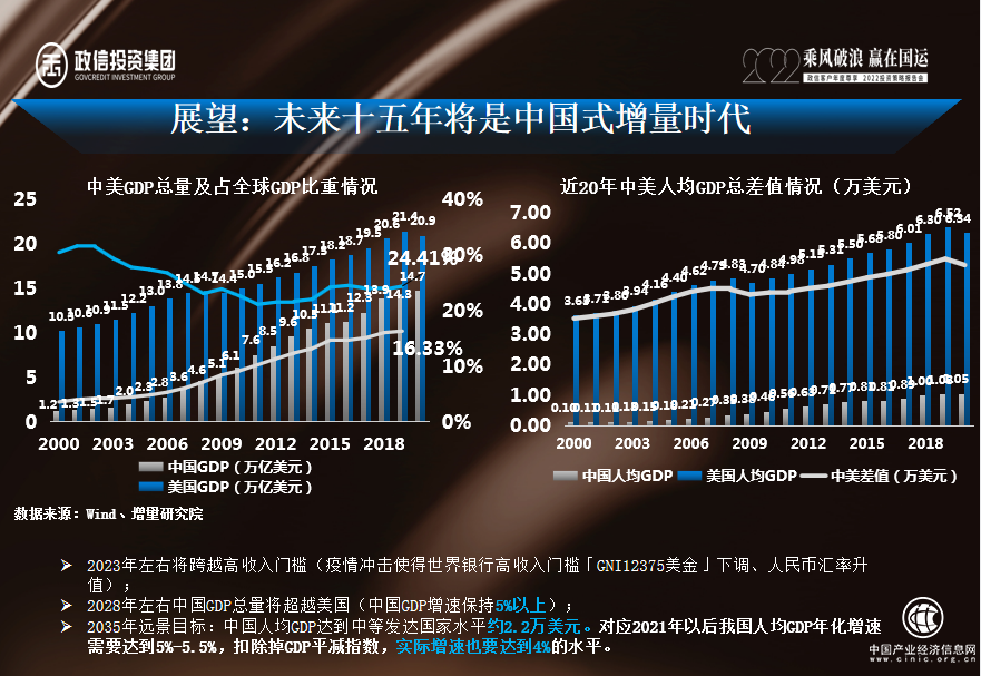 2035年,我們能夠步入中等發(fā)達國家的水平,人均GDP2.2萬美元,意味著將在當(dāng)前1.1萬美元的基礎(chǔ)上翻一倍。那么,也將伴隨著社會財富的翻倍。