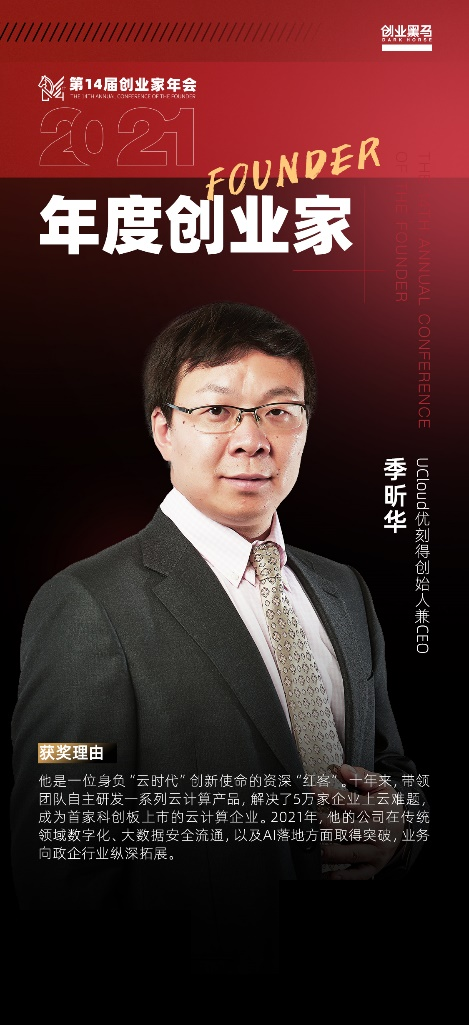 1月13日,在創(chuàng)業(yè)黑馬主辦的“第十四屆創(chuàng)業(yè)家年會(huì)上,UCloud優(yōu)刻得創(chuàng)始人兼CEO季昕華獲得“2021 年度創(chuàng)業(yè)家”榮譽(yù)稱號(hào)。