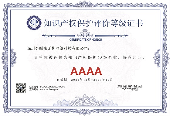 金蝶賬無(wú)憂“知識(shí)產(chǎn)權(quán)保護(hù)評(píng)價(jià)4A等級(jí)”