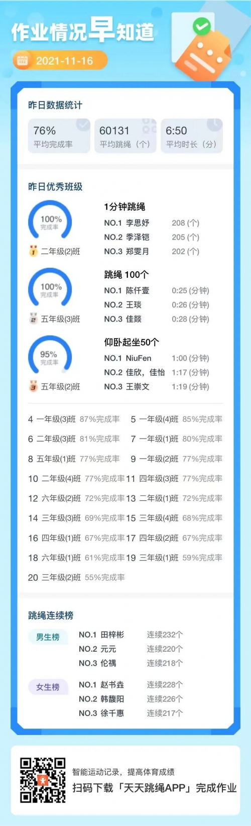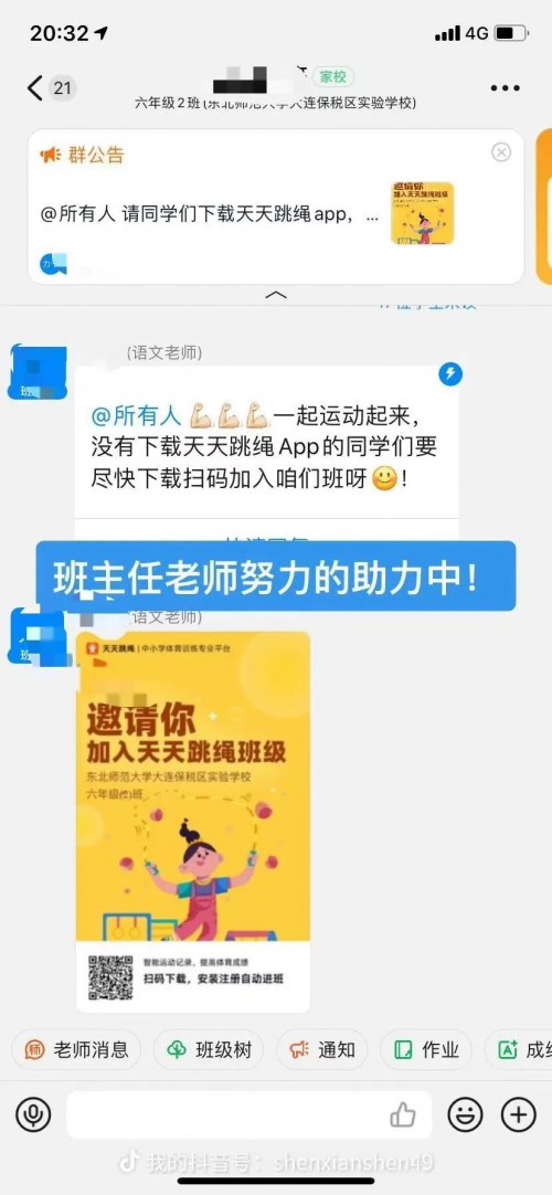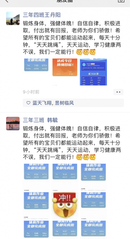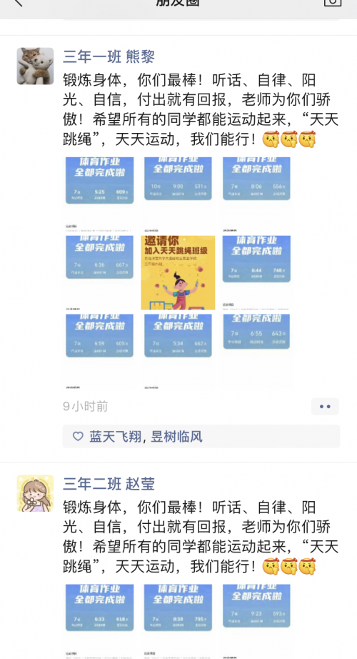 班主任老師也非常重視學(xué)生的體質(zhì)健康與體育鍛煉,全力配合體育組開展天天跳繩活動,全員加入班級的管理系統(tǒng),每日在微信群,釘釘群,朋友圈,甚至點對點宣傳天天跳繩app,督促學(xué)生完成作業(yè)。