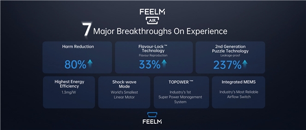 基于新一代仿生薄膜陶瓷芯的技術(shù)創(chuàng)新,不僅讓FEELM Air實(shí)現(xiàn)了薄至7.8mm的業(yè)界至薄機(jī)身設(shè)計(jì),相較上一代薄了25%。更重要的是,F(xiàn)EELM Air電子霧化解決方案取得革命性的突破,帶來用戶體驗(yàn)方面的七大突破。