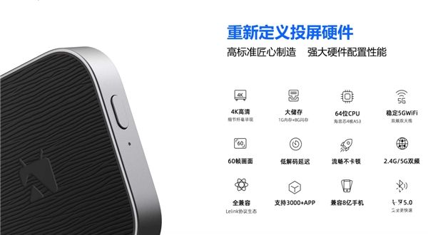 同時,樂播樂投憑借其快連接、低延遲、0卡頓等卓越的性能,成為了熱門的投屏新科技產(chǎn)品。其內(nèi)置海思64位四核旗艦芯片,可達到38毫秒肉眼無法感知的超低延遲,支持1080P/4K分辨率60幀藍光級別的畫質(zhì)水平。此外,樂播樂投攻克了許多投屏軟件無法突破的技術(shù)壁壘,除了穩(wěn)定性更好,投屏質(zhì)量更高之外,投屏過程中還能脫離手機保持工作,中途不影響用戶接打電話、回復(fù)消息等其他操作;并且,樂播樂投還突破安卓系統(tǒng)級限制,解決安卓手機鏡像大屏端沒有聲音的痛點。