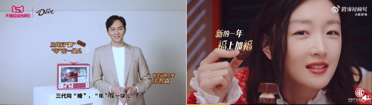 除天貓平臺的傳播外,瑪氏箭牌聯(lián)動當(dāng)紅女星周冬雨、德芙品牌大使張智霖等多位明星為天貓超級品牌日在線打call,手把手教大家解鎖“三代同糖”盒家歡禮盒新玩法,為大家送上暖心的祝福。