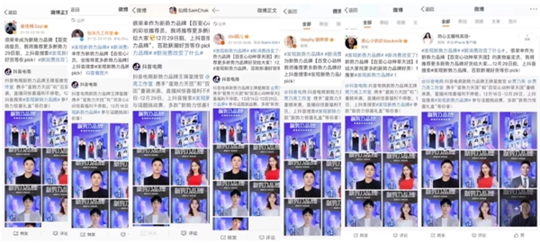 與此同時(shí),針對(duì)站內(nèi)用戶,抖音電商以特色站內(nèi)挑戰(zhàn)賽玩法激發(fā)用戶參與興趣,用話題預(yù)埋、達(dá)人拍攝內(nèi)容短視頻等方式引起用戶自創(chuàng)內(nèi)容驅(qū)動(dòng)用戶參與,形成自傳播擴(kuò)大聲勢(shì)。同時(shí)也為之后的big day、品牌自播等銷售環(huán)節(jié)進(jìn)行用戶種草和流量蓄水。截至目前,站內(nèi)話題#發(fā)現(xiàn)新勢(shì)力品牌 話題播放量已超過(guò)3100萬(wàn)次,該話題在微博端閱讀量已超過(guò)1.1億,微博話題#新消費(fèi)改變了什么#閱讀量也近5900萬(wàn)次,產(chǎn)生近5萬(wàn)人次討論。