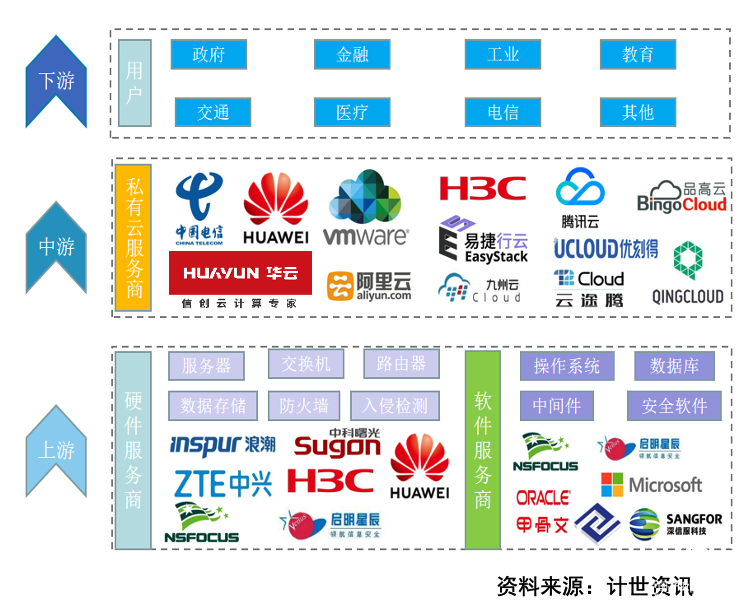 從產(chǎn)業(yè)鏈來看,目前中國私有云產(chǎn)業(yè)鏈主要由上游基礎(chǔ)設(shè)施供應(yīng)商、中游私有云服務(wù)商及下游需求用戶組成,下游用戶以政府機(jī)構(gòu)、金融、工業(yè)等行業(yè)大中型企業(yè)。