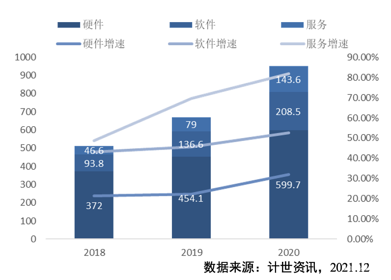 從市場結(jié)構(gòu)看,私有云市場目前依然是硬件占據(jù)主導(dǎo)地位,2020年硬件市場規(guī)模達(dá)到599.7億元,占私有云市場的63.0%。軟件及服務(wù)市場在私有云市場中的占比快速持續(xù)提升。2020年私有云軟件市場規(guī)模208.5億元,占比21.9%,服務(wù)市場規(guī)模達(dá)143.6億元,占比15.1% 。