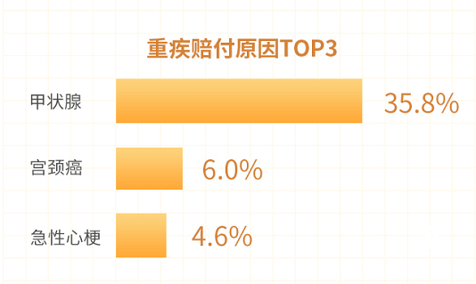 值得關(guān)注的是,年齡在18-45歲的出險(xiǎn)率最高,占比約68.6%,大多數(shù)作為家庭的頂梁柱,上有老,下有小,所以更需要盡早完善保險(xiǎn)保障,抵御未知風(fēng)險(xiǎn)!而惡性腫瘤和心腦血管疾病,依然是人類(lèi)健康的“頭號(hào)殺手”,甲狀腺癌依舊是威脅我國(guó)國(guó)民身體健康的頭號(hào)“癌癥”,占重疾理賠的35.52%,女性群體則要多注意預(yù)防宮頸癌。